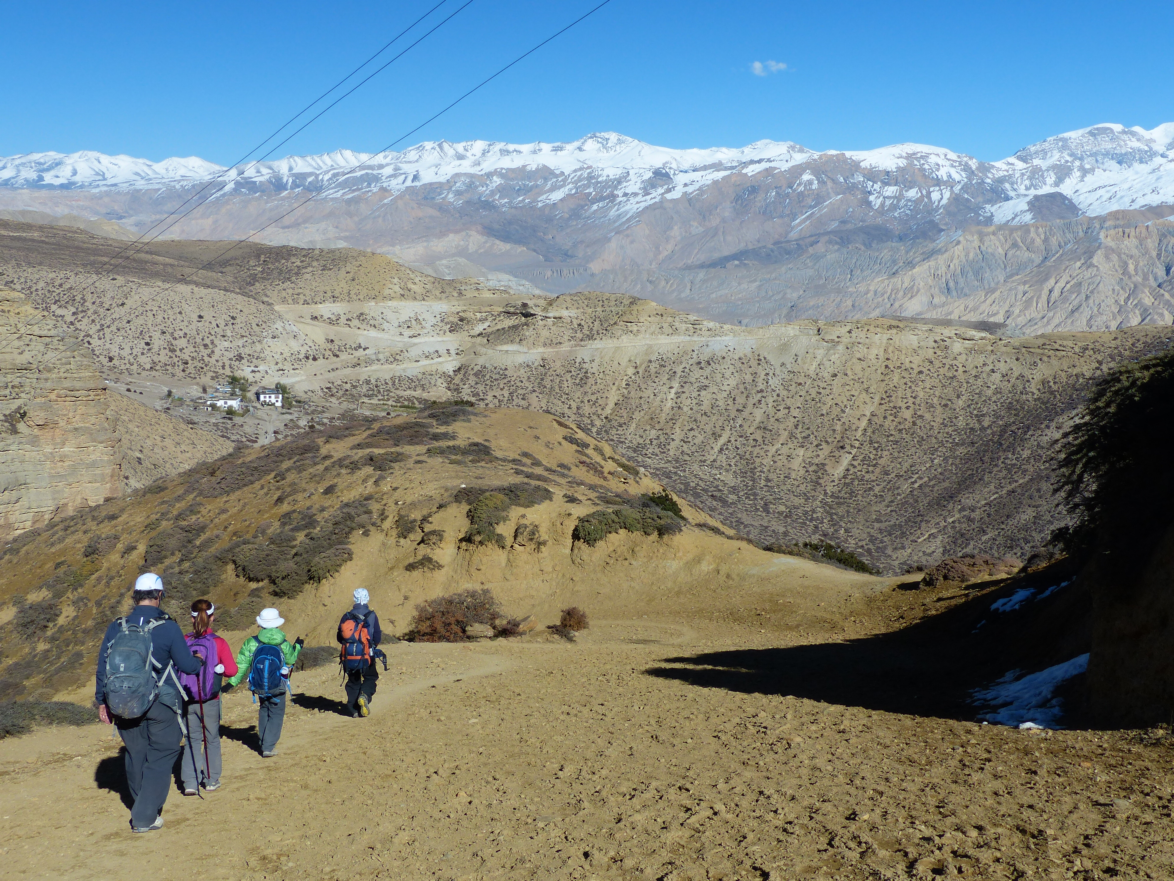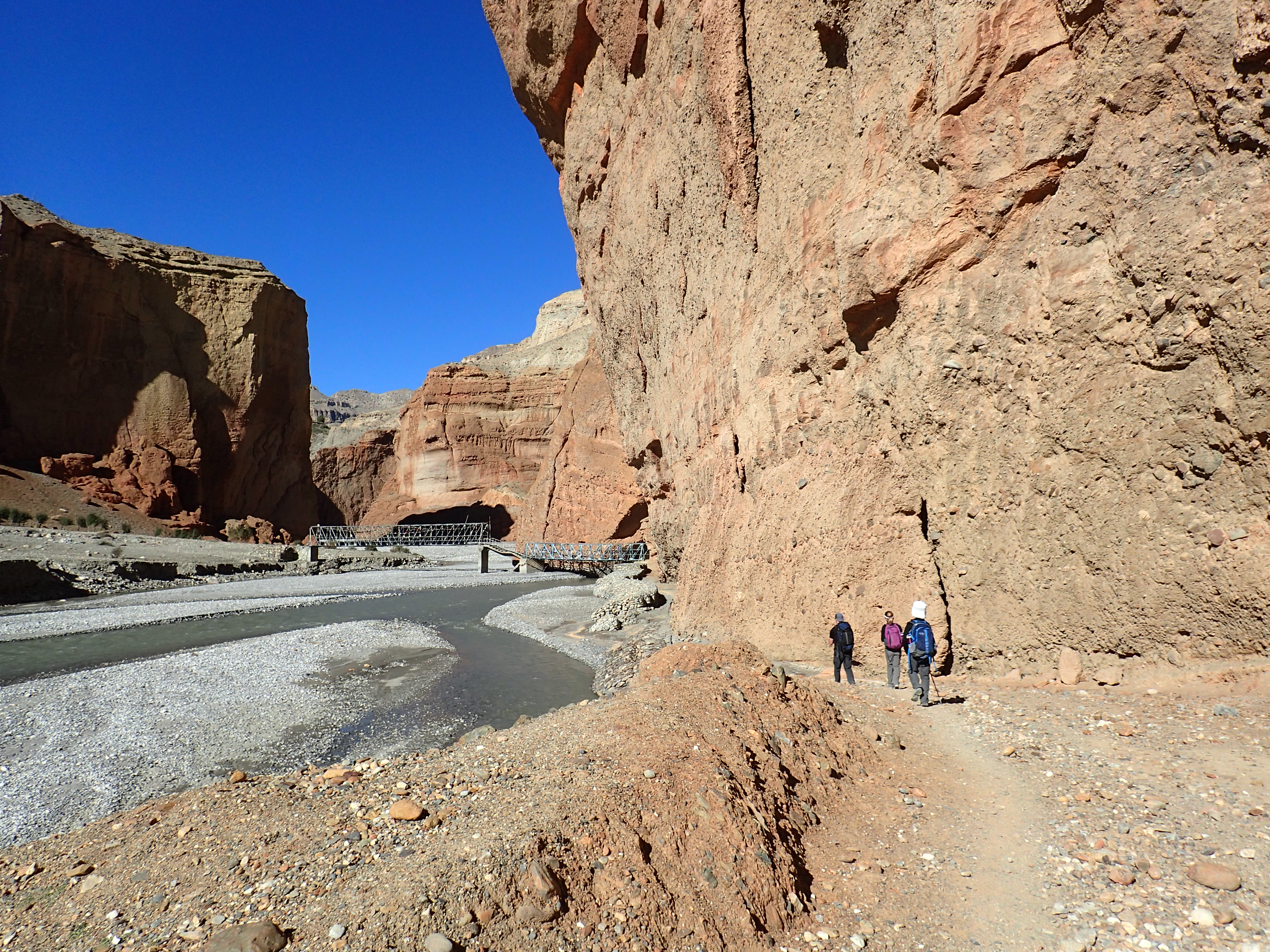 The first day and a half of hiking were easy, mostly along the Kali Ghandaki (Black River) valley floor. The terrain is rocky, almost always along a jeep road made up of river cobbles of varying sizes. Yes, there are undulations, but of a mild sort that only take 20 or 30 minutes to climb. As we finished our second day, our pleasant journey up the broad river valley ended abruptly with the steep walls of the upper canyon forming a barrier to continued progress. We climbed steeply to a bench overlooking the entire 20 km we had walked so far. It was phenomenally beautiful.