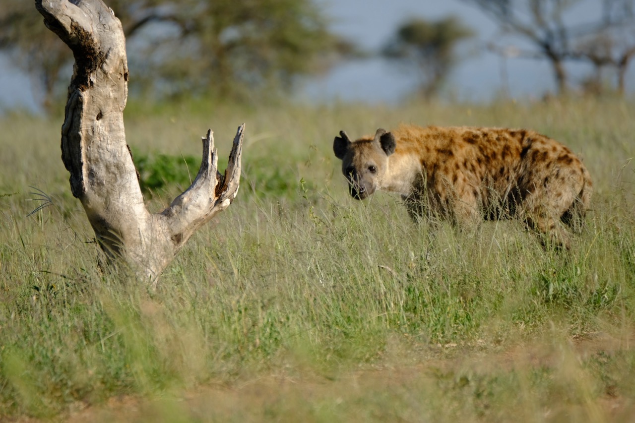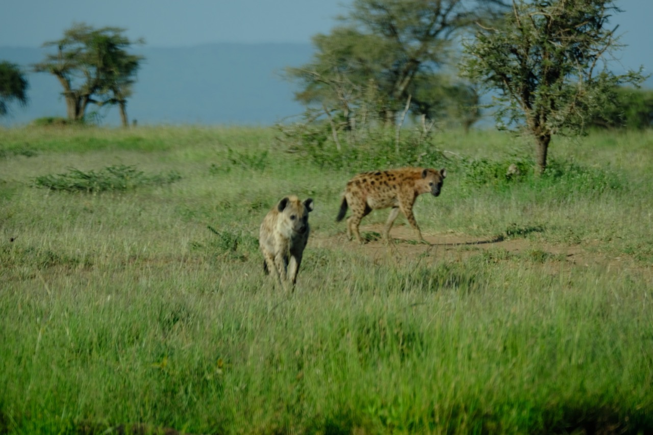 The camps in the Ngorogoro and Serengeti are not fenced which means that the animals are free to wander through at any time. Although we did not have any directly in camp, there were some on the perimeter. As the sun set and we were preparing to go up in to our roof-top tent, Colburn was enjoying a sip of Scotch whiskey at the campfire when he calmly said, “Hey, Deb, look! There is hyena just behind you.” Sure enough, there was a single hyena about 15 meters off of my right shoulder. He was not threatening, more like a coyote circling a camp curious to see what we were doing. At night, the Conservation Area has armed guards who walk the camp with an AK-47 to protect the area from any aggressive animals. Usually simply shooing them away works fine, but it was nice to know that they had fire-power if needed. We heard some other nondescript animals munching on the vegetation during the night, but nothing that impacted our sleep. The weather was cool, verging on cold, at 7,000 ft and sunrise came early.