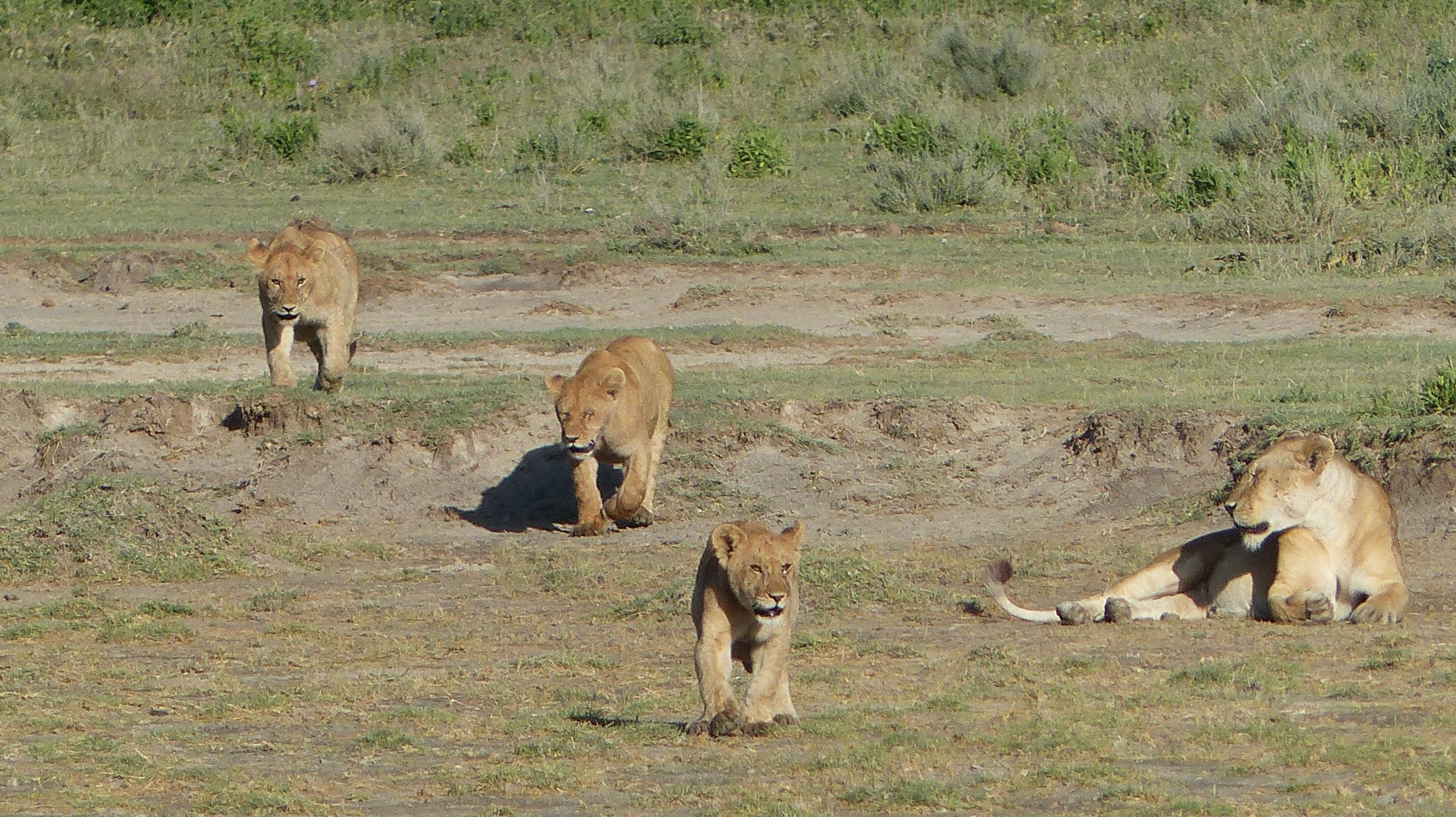 She hides the quarry in the tall grass then summons the cubs and the other lionesses. The mother gnu paces in the distance, unsure what to do. The lionesses greet each other as the cubs jockey for the tastiest bits of the catch. We watch from five meters away and listen to the incongruously deep growls of the cubs establishing dominance among the group fascinated by how something so small could make a sound so resonant. The mother gnu continues to pace in the distance. Eventually she too joins her herd and will have to wait until next year to reproduce. Such is the circle of life on the savannah.
