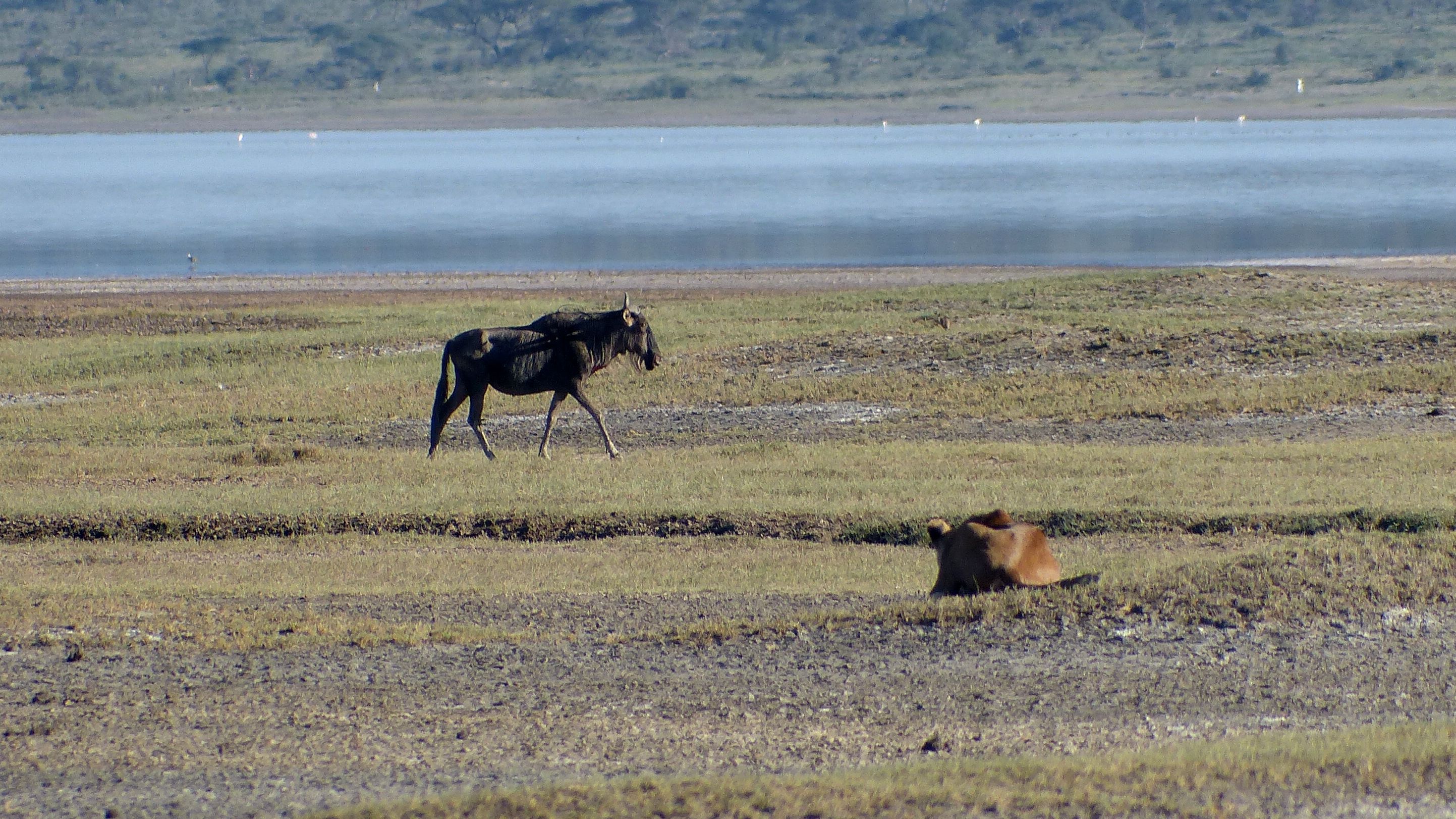 We spotted the lioness from over a kilometer away, just an unmoving dot on the barren land, yet clearly visible as something different. Our Chakra guides, Godlisten and Agray, bring us closer so we could get a better view. The lioness lay on the dirt, scanning the area to identify a gnu or zebra that is old or injured or for a mother not paying attention to where her young offspring are. As a lone hunter, it is too difficult to take down a healthy animal so instead she waits for one to show a sign of weakness or inadvertently get separated from the herd. We park behind her as she faces into the wind, the main herd behind all of us. There is a solitary gnu walking along the lakeshore. She waits and watches. The gnu sees her, but knows that she is far enough away to not present a threat as lions can run fast, but not far. She knows, however, that she is between the gnu and the herd so she waits. We wait too, not sure what to expect. The gnu is grazing absently, but is still too far away. The lioness rises and slowly creeps closer, freezing any time the gnu looks her way as gnus have poor eyesight and cannot discern an unmoving lion from a stump or rock. The tension builds as we are witnessing something that we have only seen on television. As she creeps closer, the gnu sees her and startles but does not run away. Her cover blown, the lioness gives a half-hearted chase, but the solitary gnu is still too far away. She gives up and resumes her place in the dirt; the gnu joins the herd behind us.
