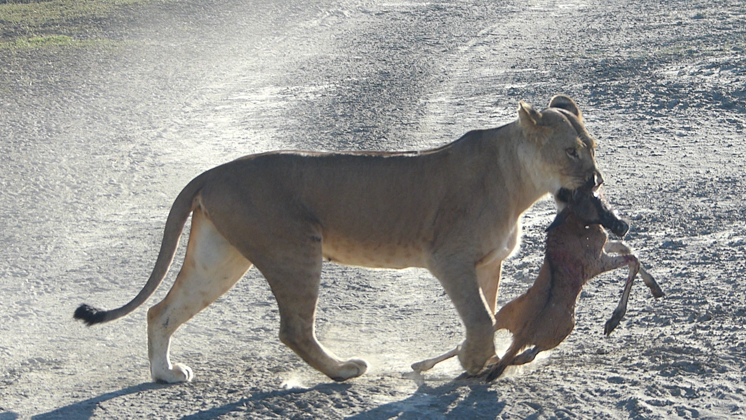 The minutes pass without other prey in sight when suddenly a mother gnu and a newborn scamper directly towards the hunter. They are easy prey. She doesn’t even have to move – the unaware gnus canter within striking distance. The lioness seizes the opportunity. Kicking up alkaline dust, she sprints towards the baby, separating it from its mother. In less than 30 seconds, the hunt is over and the lioness has captured the baby gnu. But she doesn’t kill the baby immediately. The big cats (cheetahs, leopards, and lions) typically kill their prey before they eat it, unlike hyenas which will eat their prey as soon as it is subdued. Lucia says that this type of behavior is “barbaric”, but the lioness seems to be waiting for something, perhaps so that she can teach the cubs how to make the kill themselves. Maybe we were in the way. We will never know because as she drags the catch towards the bushes, the baby gnu goes limp and we feel relief as the suffering has ended.