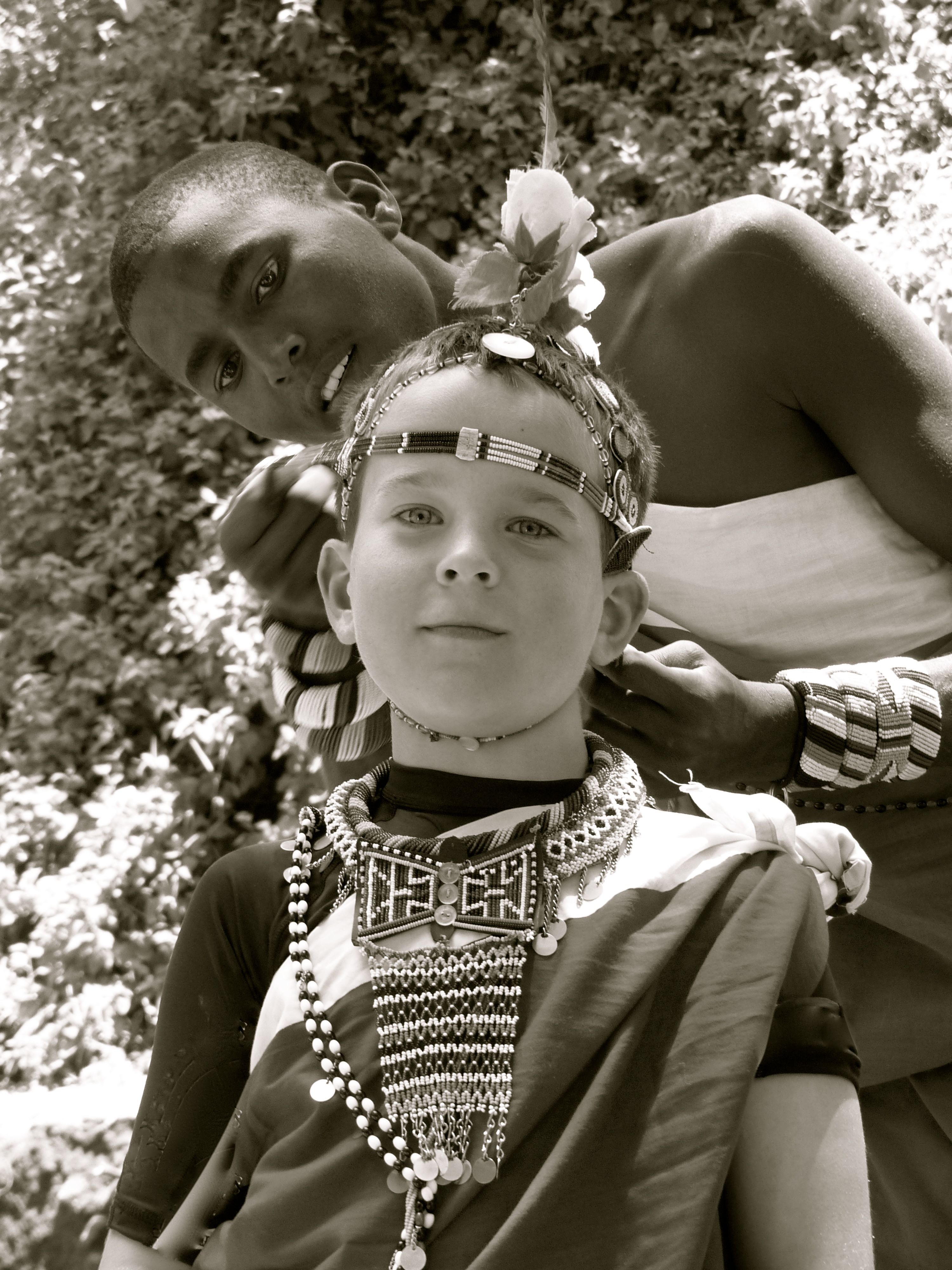 Mac immediately recognized this as a great honor. Since we have been in Africa, Mac has developed an interest in weapons of all sorts – bows, spears, knives, etc. Knowing that Peter and James are really warriors for their clans made them demigods in Mac’s view of the world. Mac realized that to have these men sharing their warrior dress with him – literally taking it off their bodies and putting it on him – was a very special honor. I will never forget the look in Mac’s eyes or the smile on his face as he wore the regalia of a young Maasai warrior.