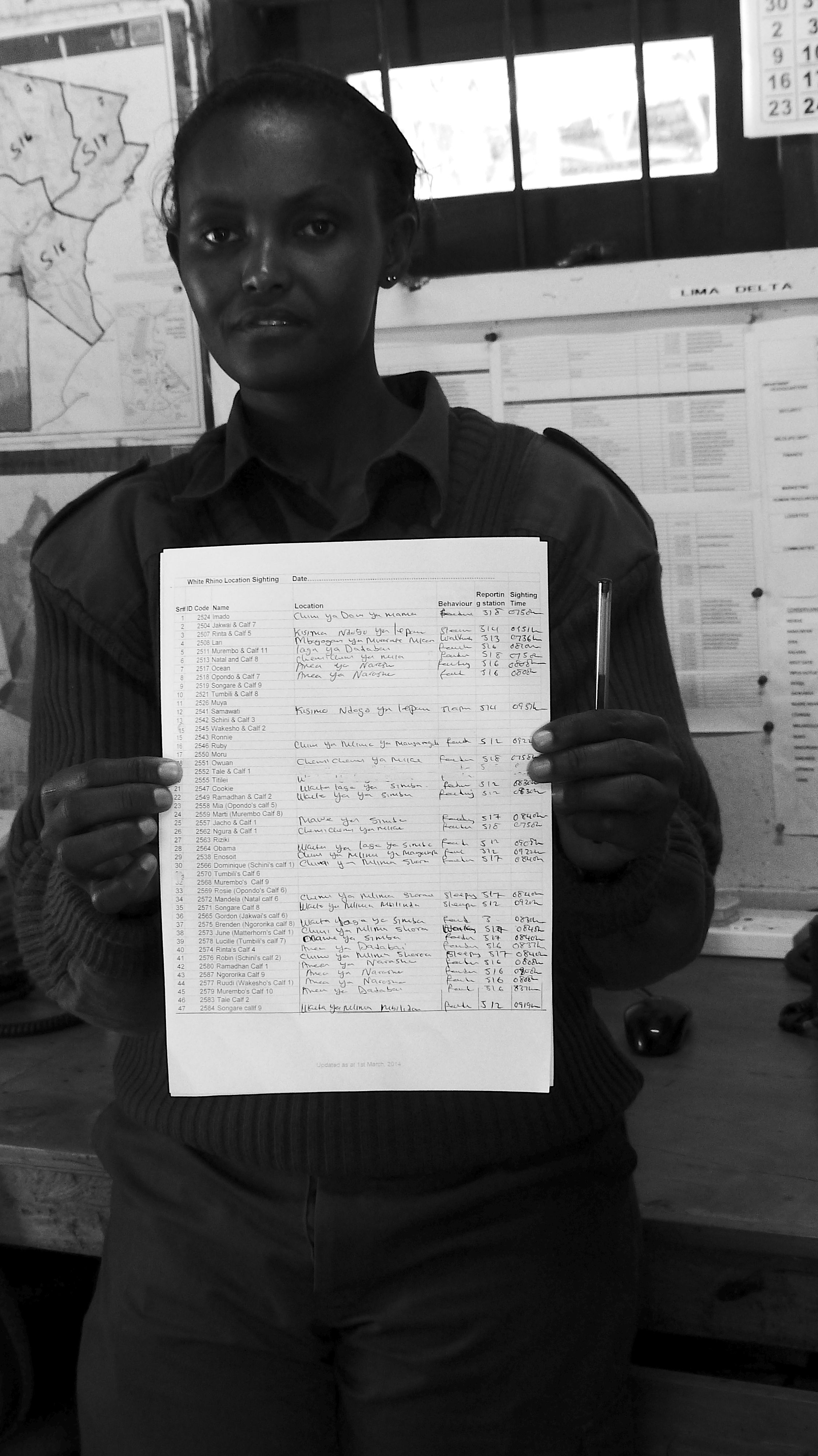 The rhino log – each rhino is tracked every day. If they don’t see the rhino for 3 days, they send out a search party to find it.